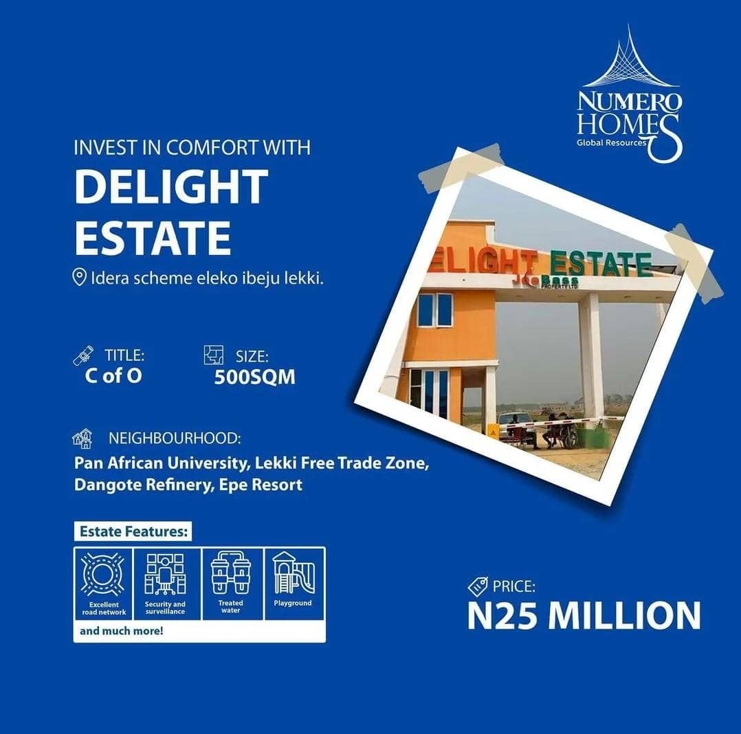Delight Estate is a an amazing and strategically located estate in Idera Scheme, directly facing the Lekki Epe Express way Ibeju Lekki. This beautiful estate is perfect investment options for home seekers and eagle eyed investors.