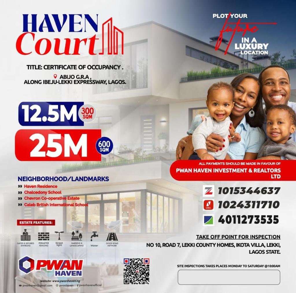 *Now Selling From 12.5Mย ๐๐๐* *An Estate of Comfort, Serenity and Luxury*ย Haven Court Estate, Abijo GRA, Ibeju lekki lagos Nigeria is an estate where serenity and nature meets. Located in the heart of Abijo GRA and situated close to notable landmarks, owning a plot or more in ROYAL HAVEN Court Estateย is a profitable move!